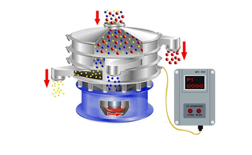 石墨粉超声波振动筛设备启动后,双振动电机产生对称激振力,带动筛框做直线或圆形振动,使进料口落入的石墨粉沿筛面均匀滑动,符合目数要求的细粉透过筛孔进入下层,粗杂颗粒则从排渣口排出,完成基础分级。同时,超声波发生器输出 20-38kHz电信号,经换能器转化为机械振动并传递至筛网,高频振动快速击碎 200-1800 目石墨粉的团聚体,实时清除筛孔堵塞。两种力互不干扰,振动保障筛分效率,超声波解决堵网难题,最终实现石墨粉的粒度分离。