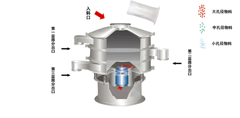 粉末涂料振动筛工作时,粉末涂层通过人工或机器投料到筛机内,在振动电机产生的振动力作用下,筛面上的粉末涂料迅速向四周扩散,小于筛孔尺寸的物料直接透网从下出料口排出,而大于筛孔的大颗粒物料被拦截在筛面上从排渣口排出,这样就完成了粉末涂料的筛选工作。